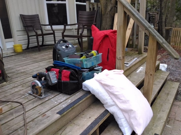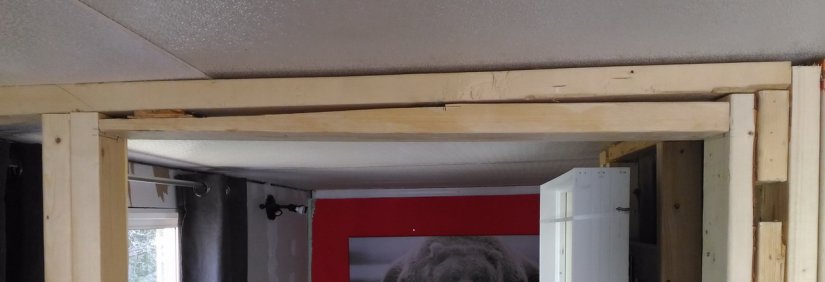 It was “interesting” solving problems with only the tools that I had thought to bring. For instance, the ceiling over the door I had to install was sloped, and less than eight feet, so the header had to be tapered with a battery circular saw and then a handsaw to get the bit that the small blade didn’t reach in the centre.