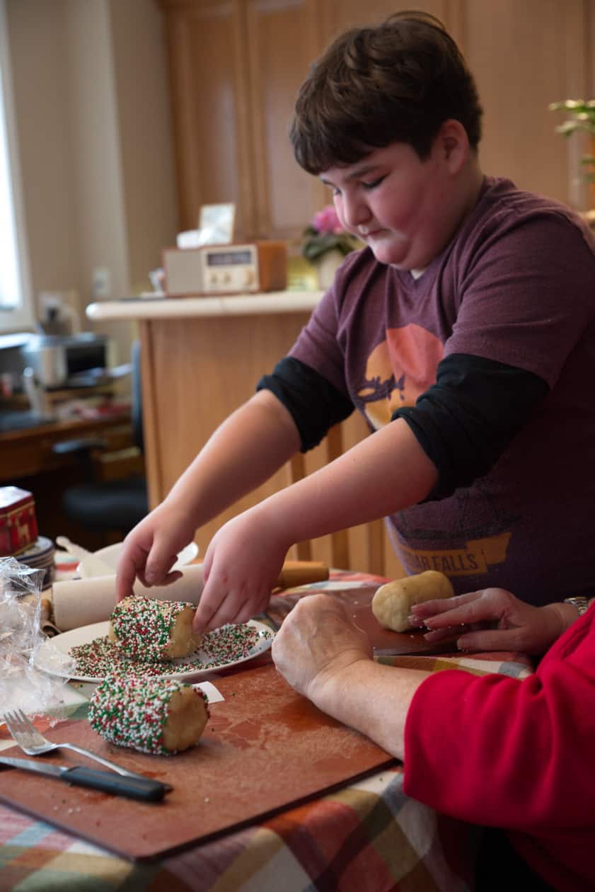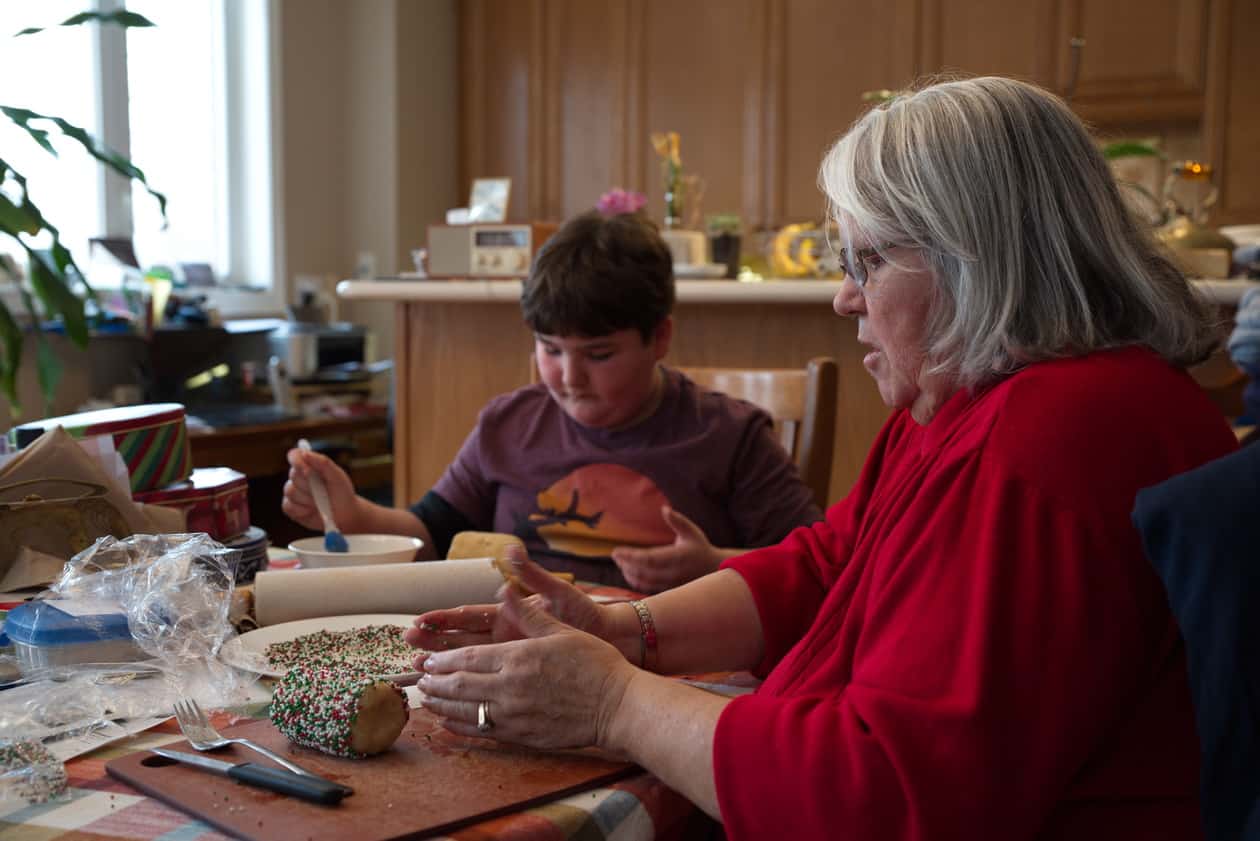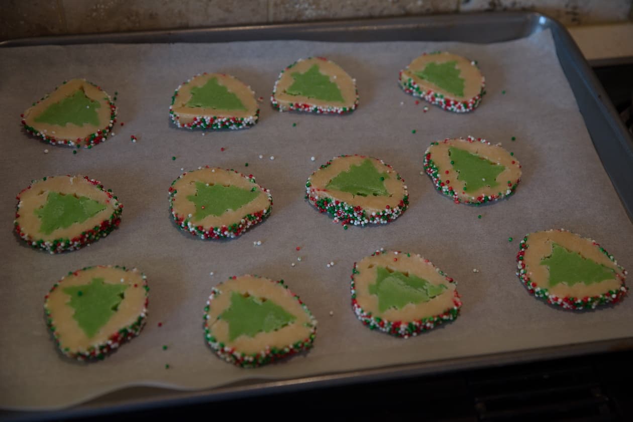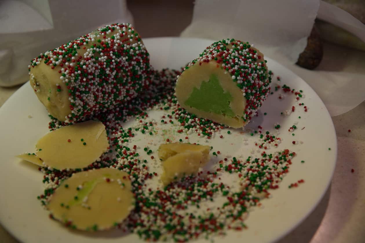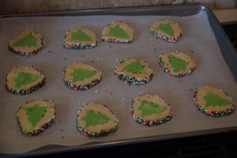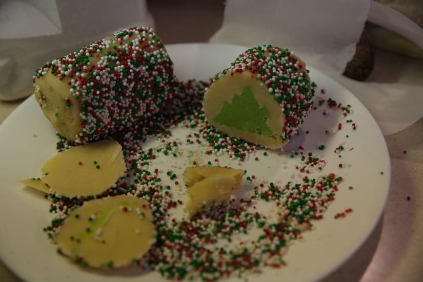 Mary-Jo also tried a new cookie which you make by creating a roll of cookie dough around a green, tree-shaped core, then slicing the roll to make the individual cookies. Sort of like the British candy where the words “Brighton Rock” go all the way through the stick. OK, too hard to explain, just look at the pictures!