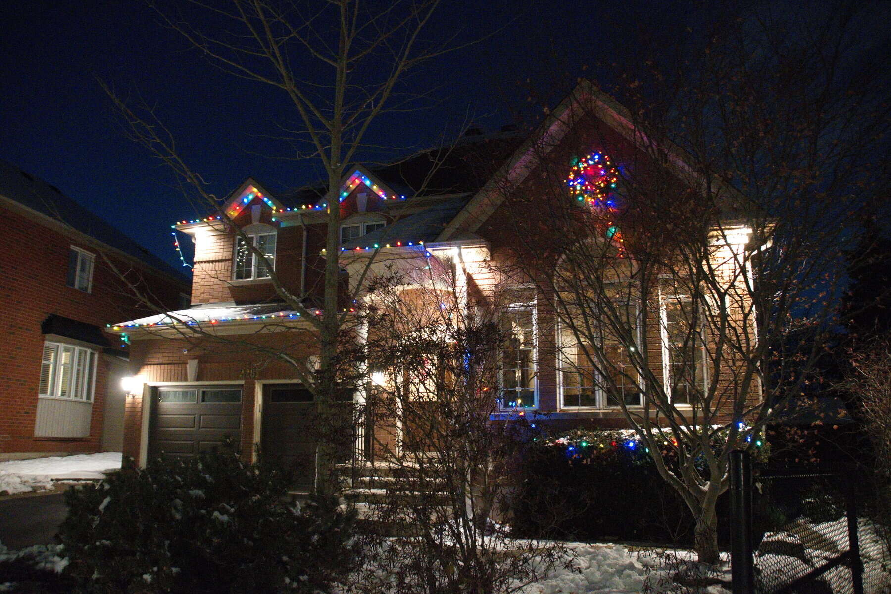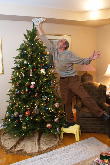 I got the outside lights up on Dec 4th and Adam came for tree decorating on Dec 6th. The picture isn’t the best set of shortbread, but it’s the only photo I got. Adam took the picture of me putting the angel on the tree and we got several takes to be sure of getting a good photo. By this time I had been flashed so many times I couldn’t see where I was putting the angel, but I think it was repositioned several times afterwards anyway! Mary-Jo ordered in for dinner and deserts so someone stuck candles in her slice.