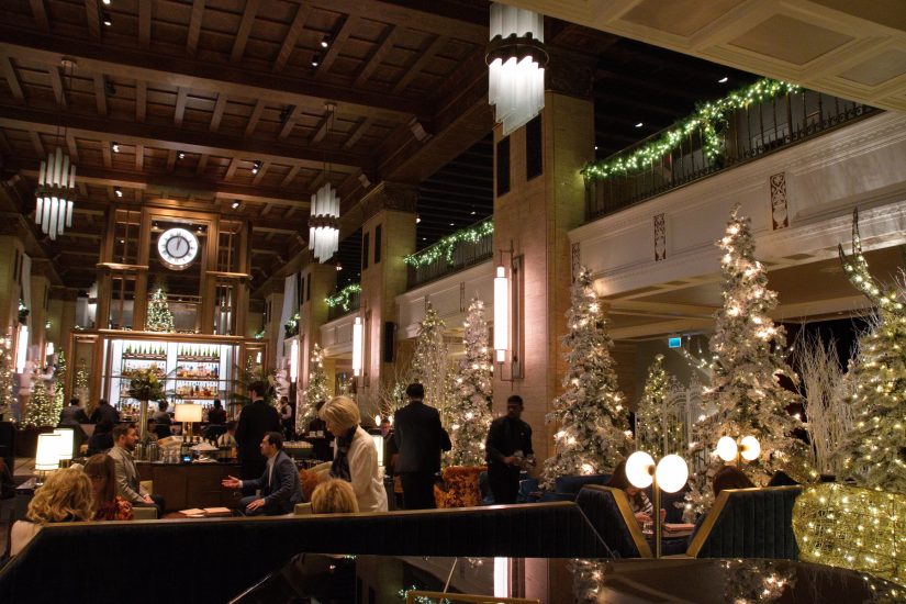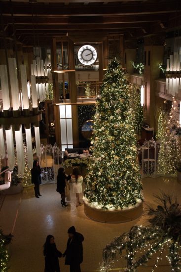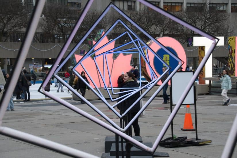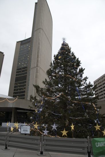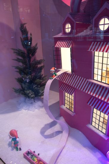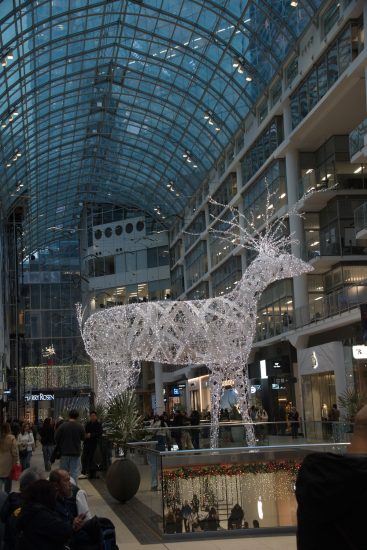 We took a quick peek inside City Hall, but it’s now all security gates and you can’t even stand under the iconic council chamber support. So we walked through the square, took pictures of the Christmas tree and the “Frames” art installation (which would have looked better if we’d waited for dusk when it would be lit up) and over to Yonge street for a look at the decorated windows in what used to be the Bay store.