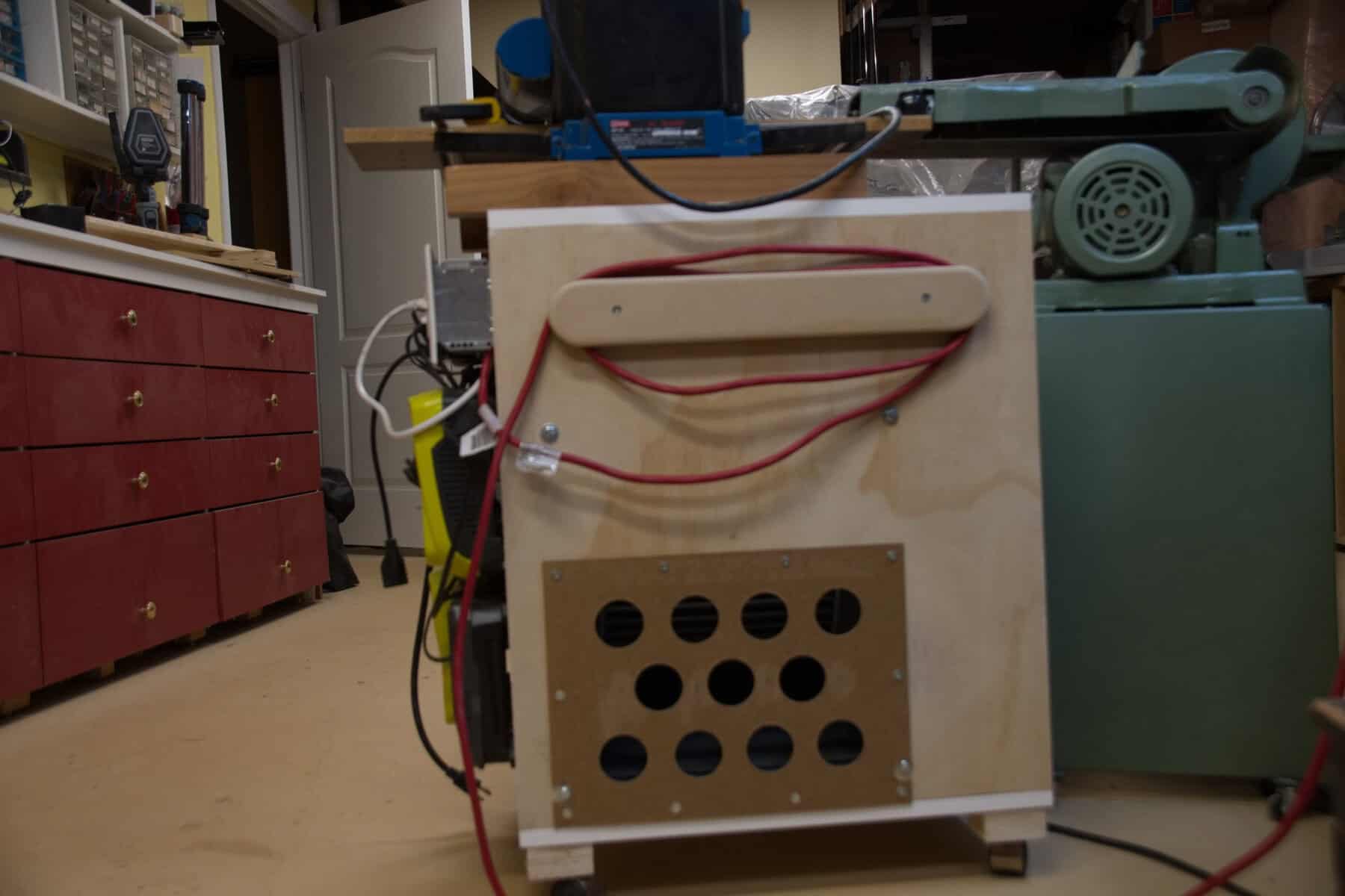 In the middle of all that, I put a cover on the fan outlet (the thing with 11 large circles in it) so that cats and small children can no longer closely investigate the spinning wheel of death. Oh, and I added a place to wind the power supply cord on, both there and on the router table. Not bad, getting that done in less than 10 years. I think.