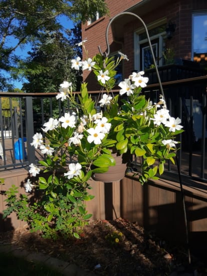 The potted Dipladenia plant that Anna brought home in 2021 and blossomed prolifically all that summer, survived overwintering indoors (thanks to David’s care, no doubt) refused to bloom until September, and now, indoors, still has one bloom.