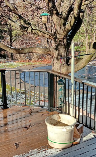 The flower bed beside the deck did better this year due to us removing the sunflower seed bird feeder. Without all the shucks burying everything, and without the pitter-patter of tiny squirrel and chipmunk feet trampling everything, we had something resembling a garden. For the winter, I’m trying a home-made hanger to place the feeder over our compost bin. Naturally, last night “someone” decided to tip the bin. Now it has two pavers inside it to make that job harder.