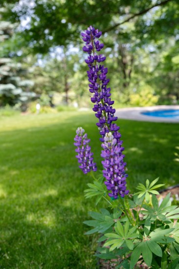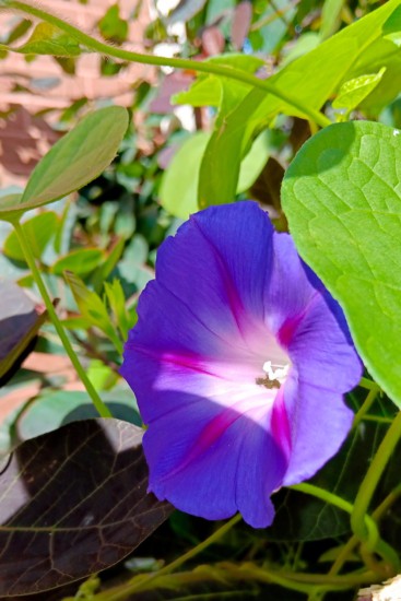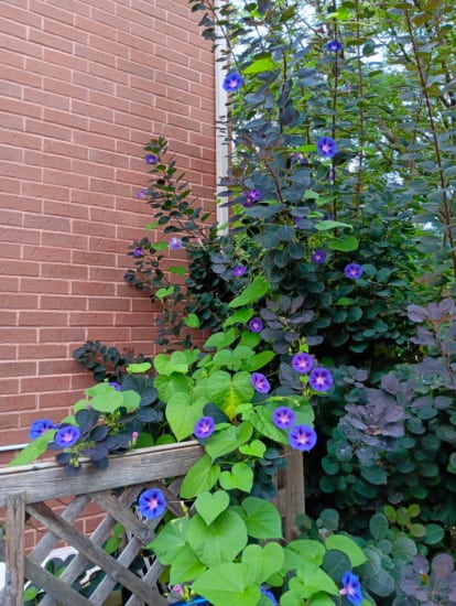 I started alyssum and morning glory seeds indoors again this year. I should have thinned out the alyssum, but it thrived despite that and was still in flower out front when I last saw it a few days back. The morning glory was not so forthcoming. I started six containers and seeds came up in all of them. I transplanted 5 of them in front of the five screens by the pool, gave each one a dedicated water bubbler, and generally pampered them. The “spare” got stuck behind the pool heater, beside the smoke bush. At the time it looked like a decent spot, as the smoke bush had not started to leaf, but soon the bush began growing in every direction, and I didn’t see #6, let alone gave it any attention until late August. The five pampered plants had produced a few tiny flowers, but generally they all gave up. But #6 had climbed six feet or so in the dark and began weighing down the smoke bush branches and flowering everywhere!