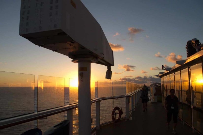 One of my cruise strategies is to get as much exercise as possible when I’m not sitting in the sun, eating, drinking or doing anything else. OK, so that’s not a perfect strategy, but there’s a reason they call these thing “vacations”, you know? Anyway, just about every morning, I did manage to get out on deck doing laps, and watching the sunrise. Most mornings I was also kicking myself because I didn’t have a camera handy, and knowing full well that if I went back for one, by the time I returned the colours would be gone, So I contented myself with enjoying the view. However, on the last day at sea, I did carry my camera, and these photos are the result. (Except for the one which is actually a sunset; mostly, I missed sunsets because they coincided with dinner, and we all know how important dinner is!)