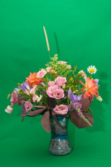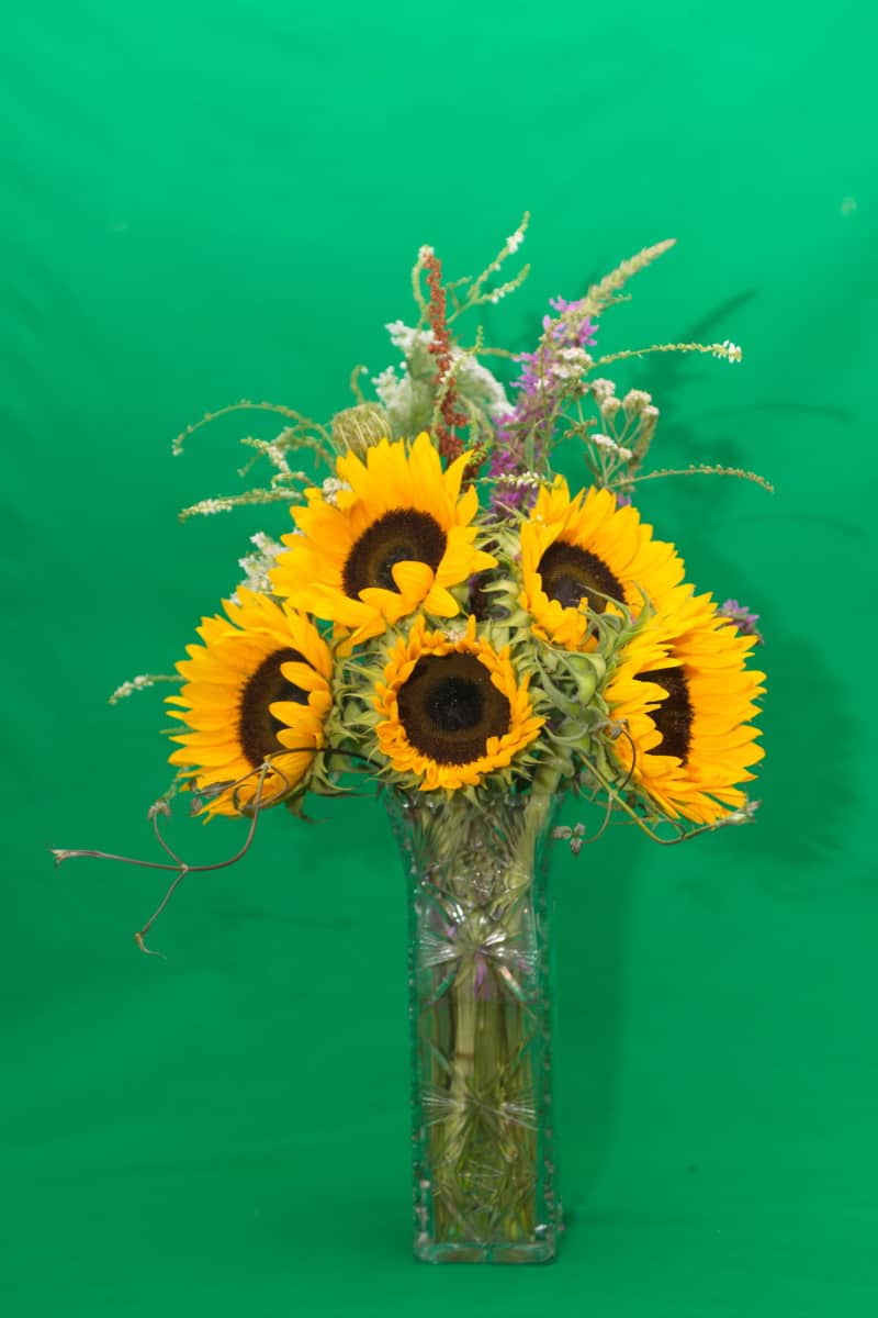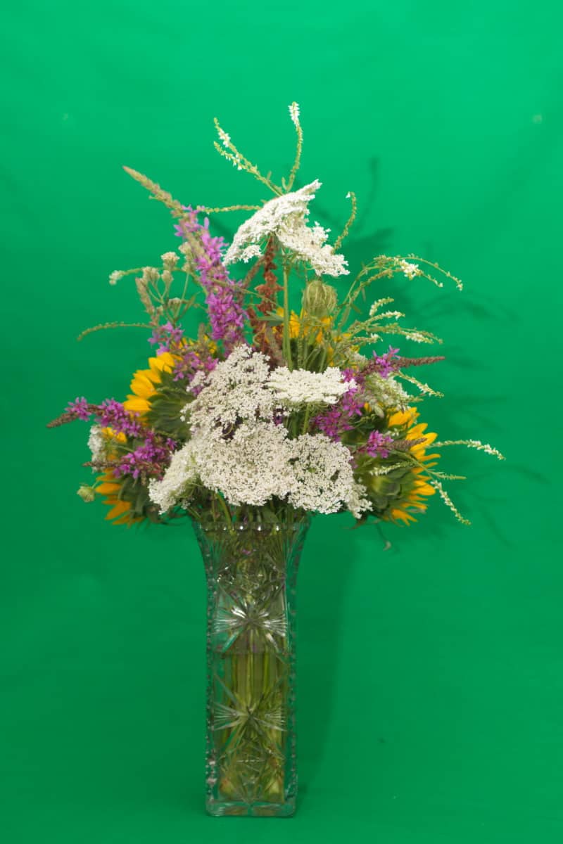 I thought it would be a good idea to use my “green-screen” backdrop for taking some of the photos, so I could replace the background with whatever I came up with. It turned out that this wasn’t a great idea, as half of the arrangement disappeared when I removed the background. Who knew floral arrangements would have green in them?