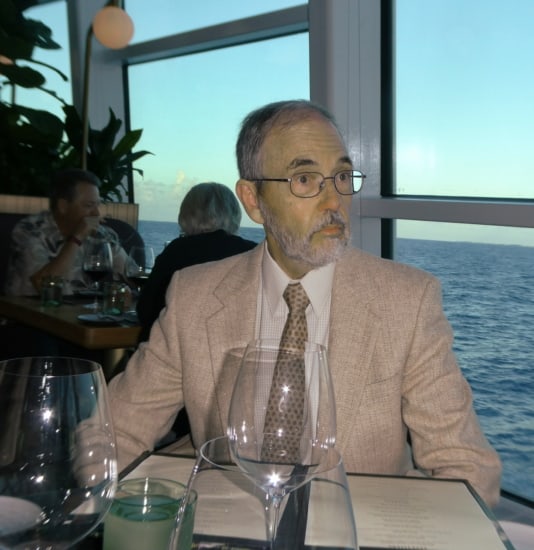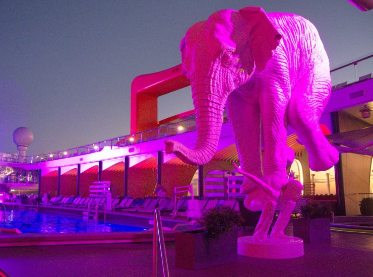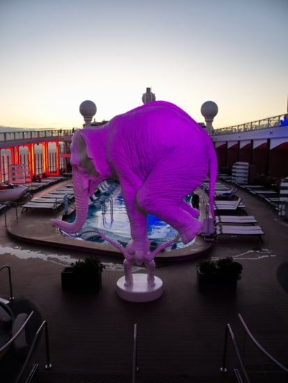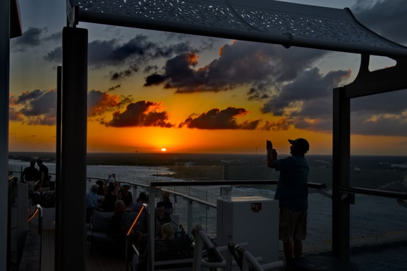 Day 6 was Grand Cayman, which is a tendering port. I had originally planned to go ashore briefly, if only to get a water-level photo of the ship, but Mary-Jo got up early and staked out a fancy canopied deck bed, and I got lazy, so no one set foot in Grand Cayman. That evening we dined at Eden, right above the propeller. The two nighttime looking photos are actually early-morning-walk photos.