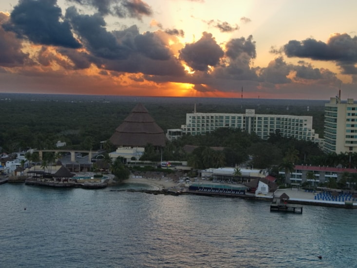A short hop, skip and… well, I suppose the ship didn’t do any of those, but the next morning we were in Cozumel. Right opposite the ship was the hotel we stayed at for a week way back, when the hotel was a cab ride out of town. The big thing that looks like a giant thatched hut is the outdoor bar. The sun was quite accommodating in rising in the background – two shots in one.