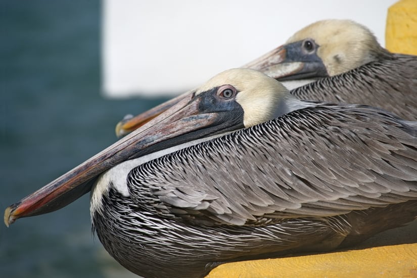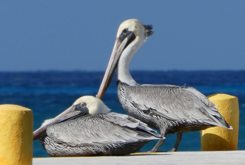 On the bright side, the first thing I saw after arriving was a pair of pelicans on the dock. Of course, I went to get photographs, and ended up sitting on the dock about ten feet away, taking pelican portraits. Meanwhile, back in the shade, on a comfortable chaise, Mary Jo got out her camera with a 30x zoom and got a shot I’d be proud to call my own, in fact in a short while I probably will be calling it my own! Behind the pelicans were a bunch of Royal Terns who all turned together as the wind shifted. I suppose that’s why they are called terns.