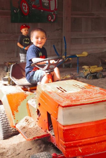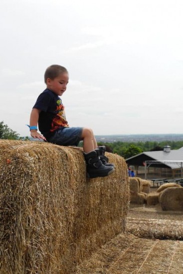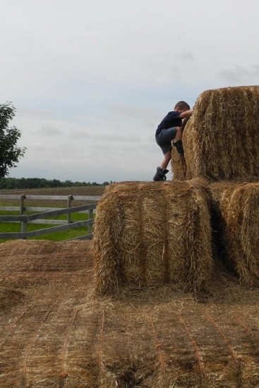 Mary-Jo, Travis and I went to get strawberries yesterday and had some fun playing in the kiddie park. There was a petting zoo (well, actually a pay 25 cents for three sunflower seeds, drop two and feed one to the goat zoo), tractors, slide pipes and straw bales to play on.