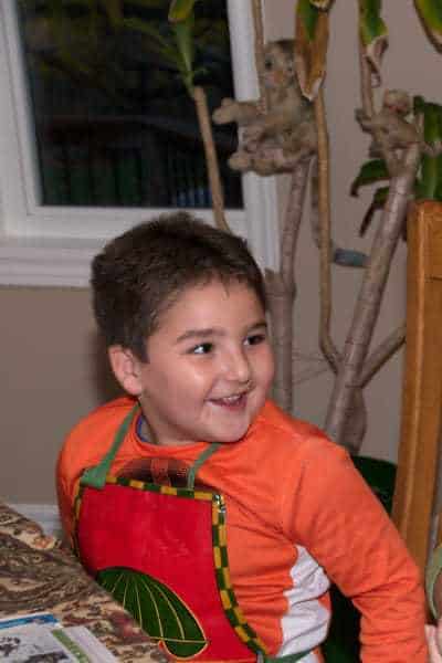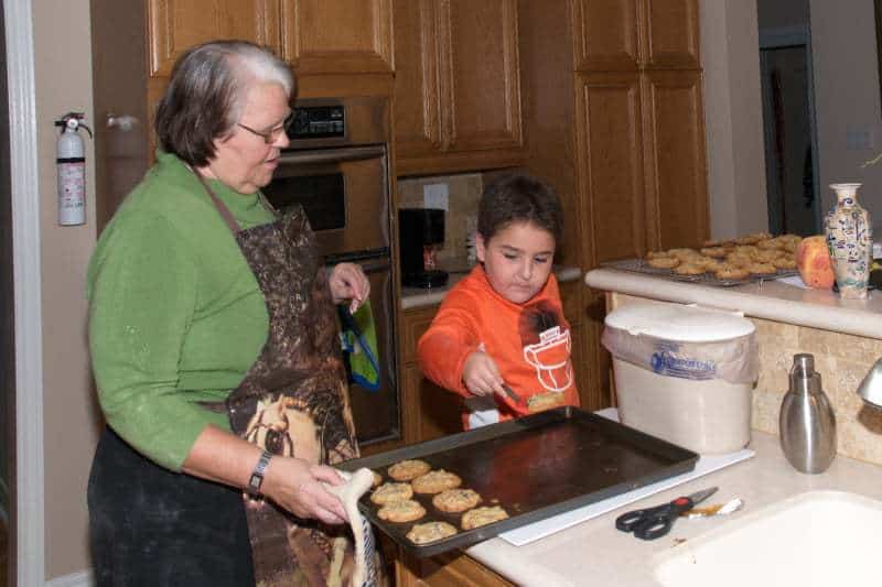 When he visits, Travis’ favourite activity is helping to make cookies. This year he graduated to very carefully taking the cookies off the tray and putting them on the cooling rack. He and Grandpa also made a wooden house in the workshop, with Travis pounding in the nails, helping on the drill press to make round “windows”, and painting it the next day.