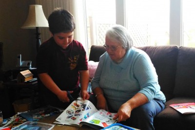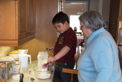 We get to see Travis once every four to six weeks because that’s how long it usually takes us to recover. He’s a rolling dynamo, never stops! When he’s here, he usually goes out with Clare and Grandpa for dog walks, and he has a bike and helmet here so if the weather is good, we go for a ride. David had to remember how to fix a puncture because one time the back tire was flatter than a pancake, and wouldn’t hold any air at all. It needed a new inner tube. Travis loves to help Mary-Jo bake; he measures flour, cracks eggs and runs the mixer (occasionally a little too fast!). He cooks a great pancake too. He’s learning to use some tools in David’s workshop (the ones that don’t cut off body parts) and can drill holes, hammer nails and pull out the bent ones. He joined us when we went to Pamela’s at Thanksgiving and had a great time with our great-great-nephew Jacob. He’ll be here again in mid-December and we hope to see him just after Christmas because there just may be some packages for him under the tree.
